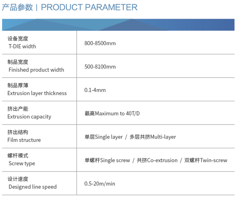 設備按制品結構所需可選擇單層/多層共擠等工藝,還可裝備還可裝備原料自動計量配料系統(tǒng),多工位自動收卷系統(tǒng)、瑕疵檢測、在線測厚、全自動調(diào)節(jié)模具、在線分切、卸卷稱重、遠程維保系統(tǒng)等功能件。